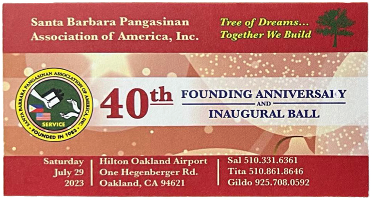Santa Barbara Pangasinan Association of America Inc., cordially invites you to the 40th Founding Anniversary and Inaugural Ball on the 29th of July, 2023 Saturday,